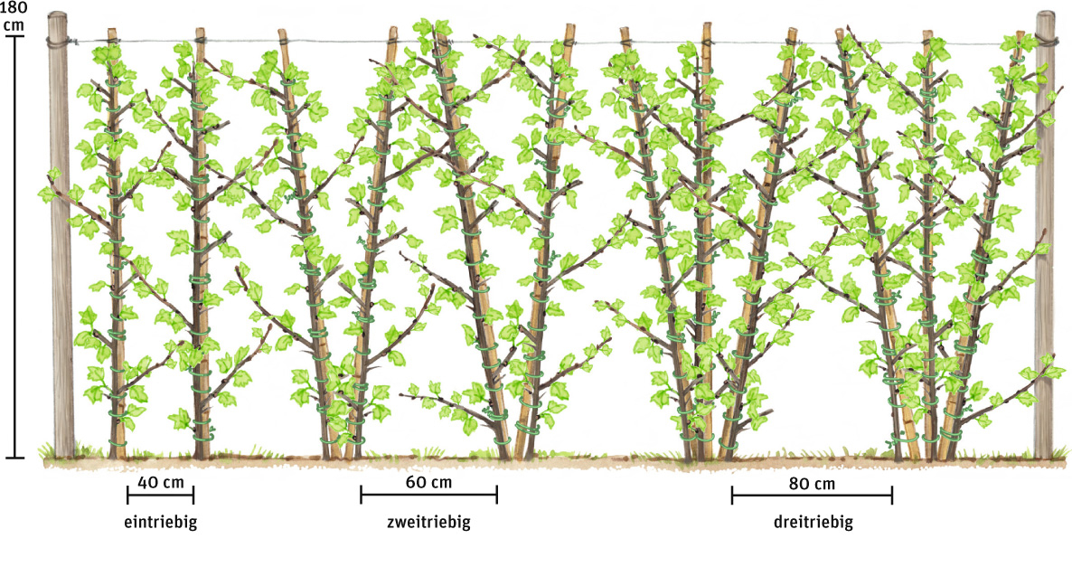 Beeren am laufenden Meter: Bei einer Stachelbeer-Hecke am Gerüst können Sie die Beerensträucher ein-, zwei oder dreitriebig erziehen. Beachten Sie dabei die unterschiedlichen Pflanzabstände.