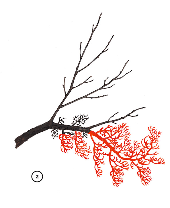 Im ersten Schritt der Fruchtholzverjüngung entfernen Sie bei allen Fruchtästen die alten Fruchtholz-„Fahnen“ komplett durch Ableiten auf das höher liegende, jüngere Fruchtholz (siehe Abb. 2). Abschließend werden noch vorhandene alte Fruchtholzbereiche an den Leitästen und der Stammverlängerung ausgelichtet (siehe Abb. 3).