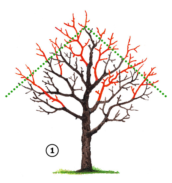 Nach dem Verjüngungsschnitt sollte die Baumkrone die Form einer Pyramide haben – so kommen viel Licht und Luft an alle Kronenbereiche (siehe Abb. 1). Gleichzeitig werden durch diese Baumform die Leitäste im Sommer schattiert, und ihre Rinde ist so vor starker Sonneneinstrahlung geschützt.
