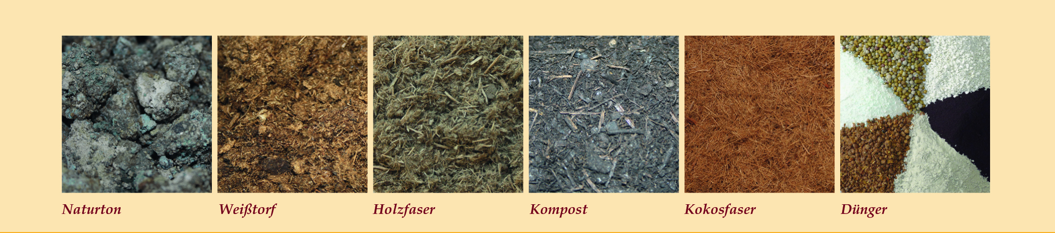 Man unterscheidet Rohstoffe und Zuschlagstoffe. Bei Rohstoffen handelt es sich um mehr oder weniger naturbelassenes Material, das z.B. durch Siebung, Auffaserung oder Kompostierung für die Herstellung von Erden vorbereitet wird. Rohstoffe wie Torf, Ton, Holzfasern, Kompost oder Rindenhumus machen den wesentlichen Charakter eine Erde aus. Dazu zählen Struktur, Wasserspeicherfähigkeit, Wasseraufnahme, Gewicht oder der Anteil an organischer Substanz.