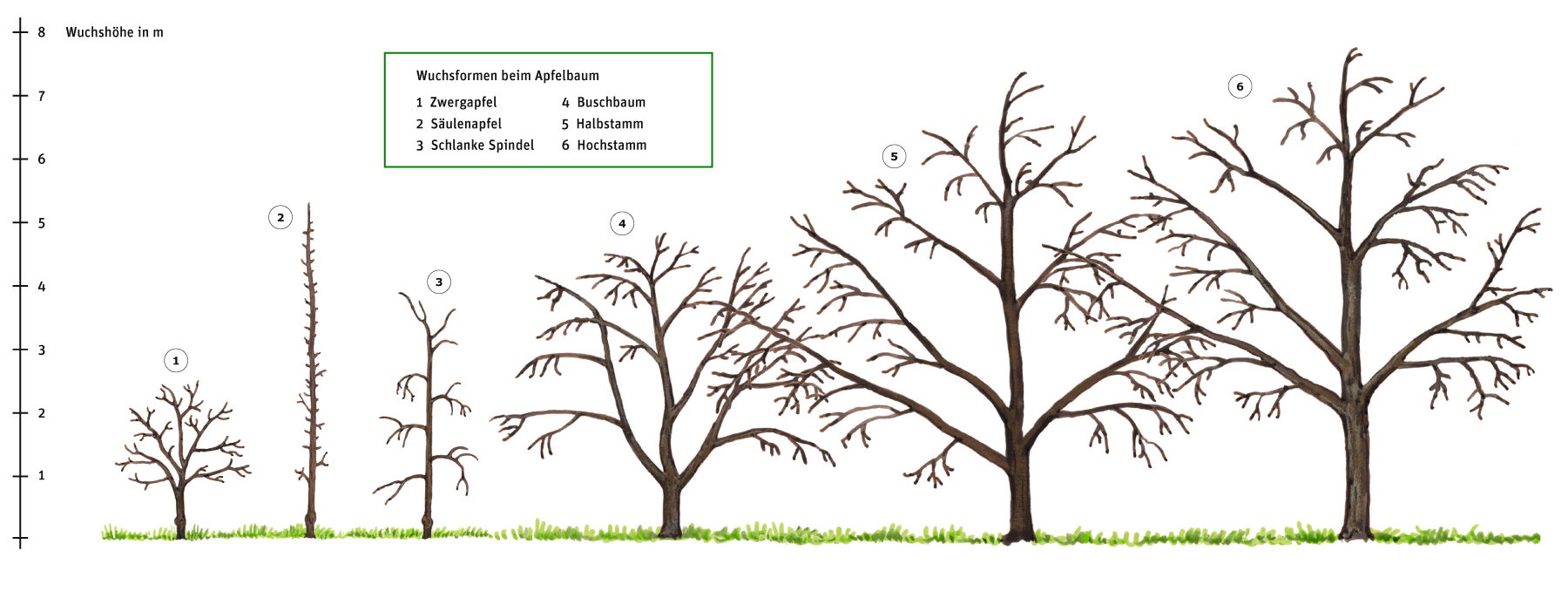 Abhängig von Unterlage und Edelsorte gibt es eine große Bandbreite verschiedener Baumformen, Stammhöhen und Wuchshöhen – vom Zwergbäumchen bis zum Hochstamm.