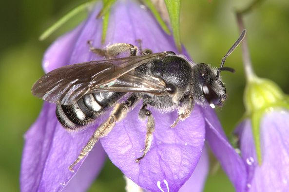 Der Name ist Programm bei der Glockenblumen-Schmalbiene. Sie ist schmal, vergleichsweise klein – und schwarz. Pollen sammeln die Weibchen fast nur an Glockenblumen. Wo es keine gibt, ist auch die Biene nicht anzutreffen.